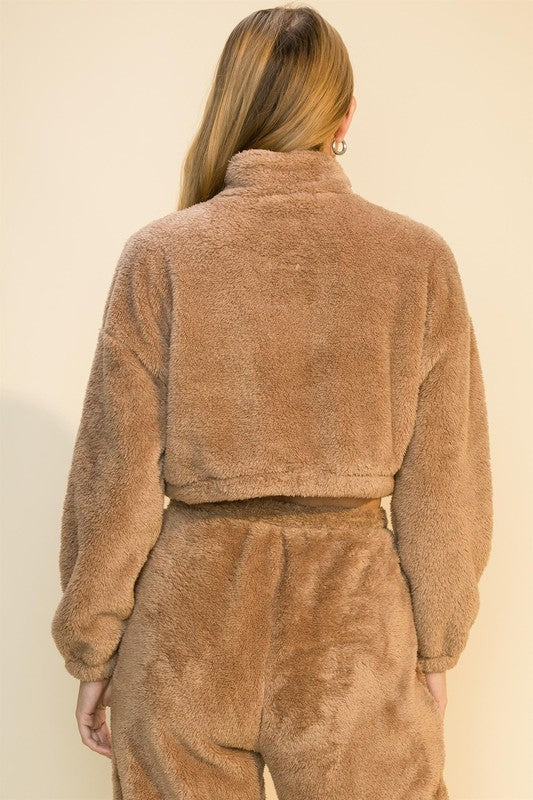 Fuzzy Cropped Sweater With Half Zipper High Neck